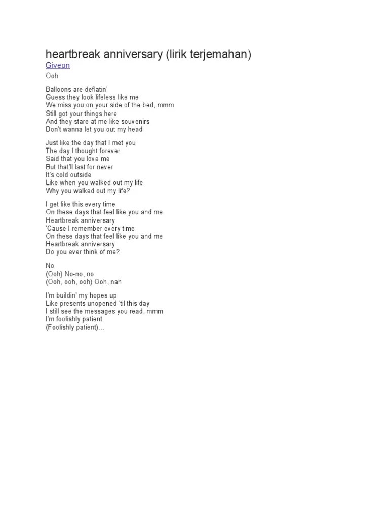 Aku merasa mereka terlihat tidak bernyawa . Berikut lirik heartbreak anniversary dan terjemahan milik giveon lengkap dengan arti serta makna lagu yang diinterpretasikan secara . Heartbreak anniversary lirik terjemahan lirik & video klip mp4. intro ooh verse 1 balloons are deflated. Layanan mobile dari situs entertainment terbesar indonesia, kapanlagi.com.